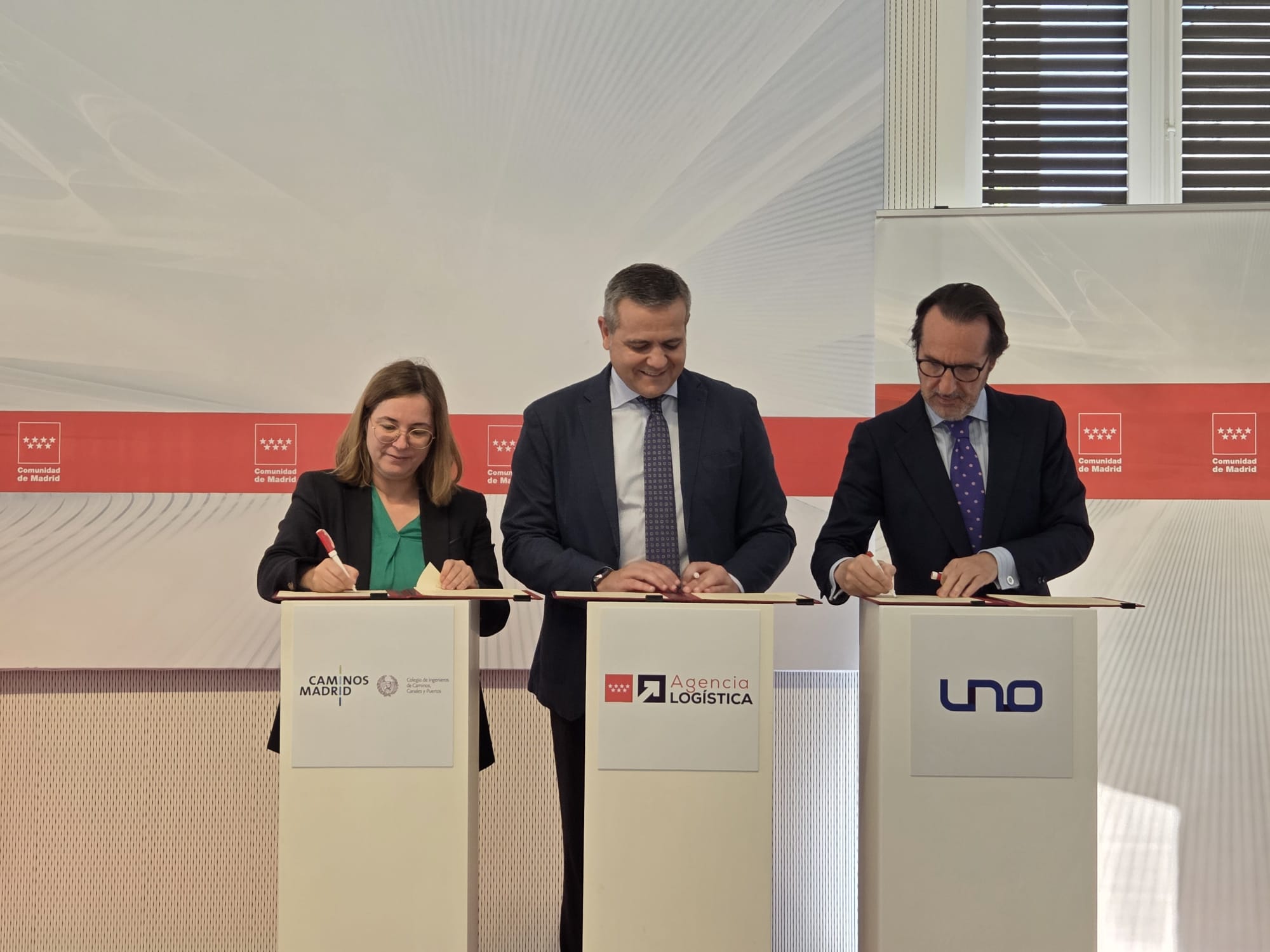 El acuerdo ha sido rubricado por el consejero de Vivienda, Transportes e Infraestructuras, Jorge Rodrigo, la decana de Caminos Madrid, María Dolores Esteban, y el presidente de UNO Logística, Francisco Aranda, en un acto en el que también ha participado la Agencia Logística de la Comunidad de Madrid.