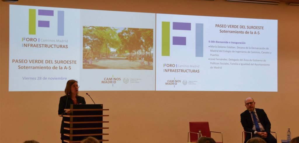 La decana de Caminos Madrid, en su bienvenida al Foro, destacó el carácter de regeneración urbana del proyecto y la importancia de planificar para un Madrid que ha superado ya los 3,5 millones de habitantes. Recordó que el soterramiento de la A-5 y la creación del Paseo Verde liberarán cerca de 80.000 m² de zonas verdes, más de 7.200 árboles y un corredor peatonal y ciclista capaz de mejorar de forma sustancial la conectividad y el disfrute del espacio público.